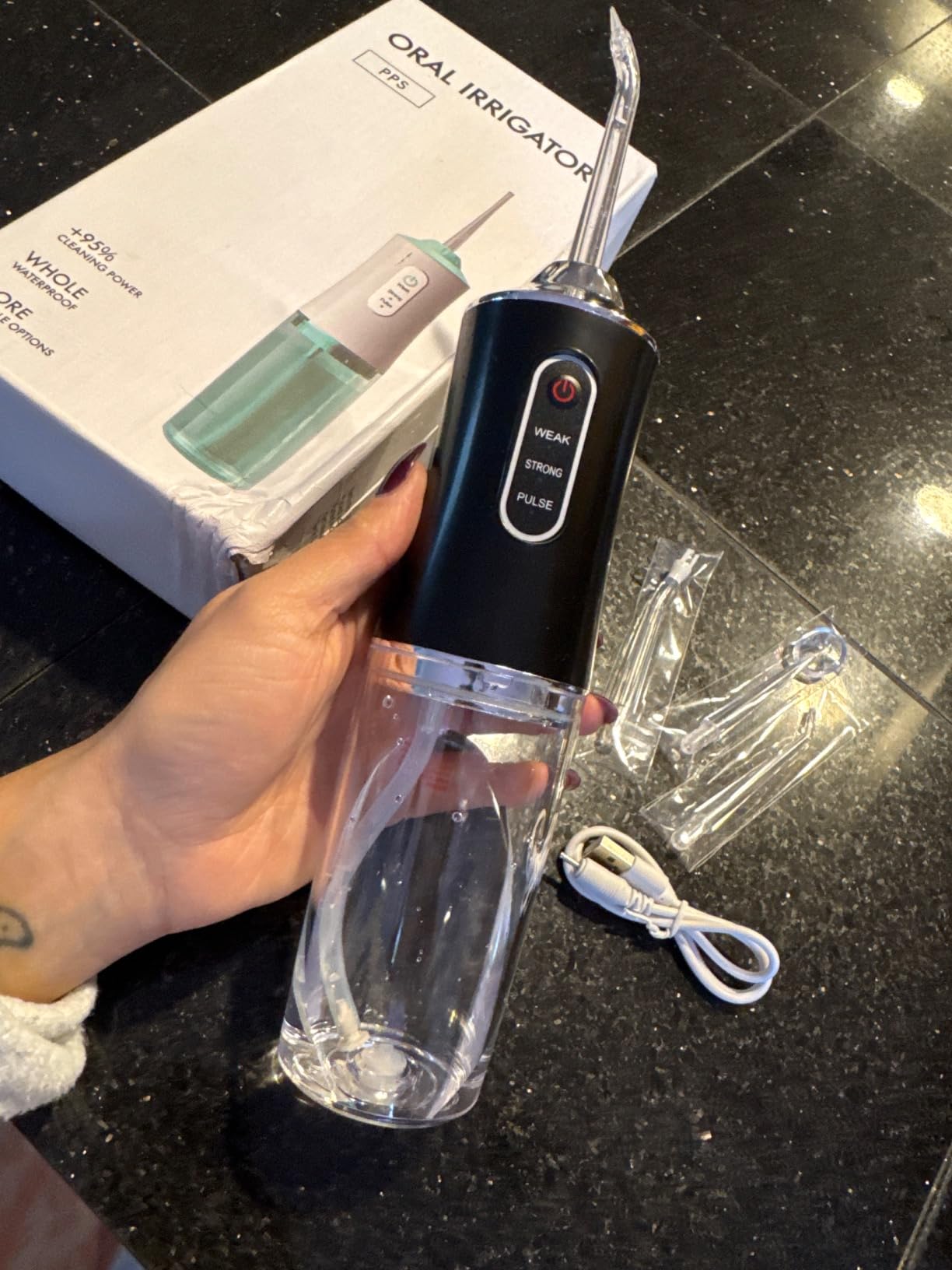 Para nada. Solo llenas el depósito con agua o enjuague bucal, presionas un botón y listo. Es rápido y práctico.
